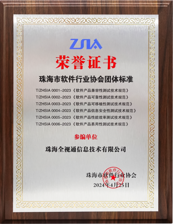 参与制定的六项团体标准正式发布,并获珠海市软件行业协会授牌。这些标准包括《软件产品兼容性测试技术规范》(T/ZHSIA 0001-2023)、《软件产品可靠性测试技术规范》(T/ZHSIA 0002-2023)、《软件产品可移植性测试技术规范》(T/ZHSIA 0003-2023)、《软件产品信息安全性测试技术规范》(T/ZHSIA 0004-2023)、《软件产品性能效率测试技术规范》(T/ZHSIA 0005-2023)以及《软件产品易用性测试技术规范》(T/ZHSIA 0006-2023)。