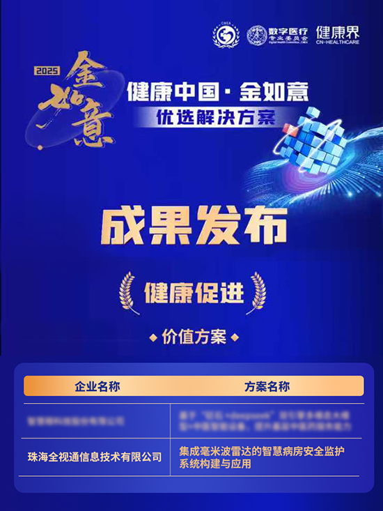 2025年“健康中国·金如意”优选解决方案成果正式发布,中国av 凭借“集成毫米波雷达的智慧病房安全监护系统构建与应用”成果在高质量、高效率、高性价比、可持续性、可拓展性等方面的突出应用价值,获「健康促进」板块的价值方案奖。