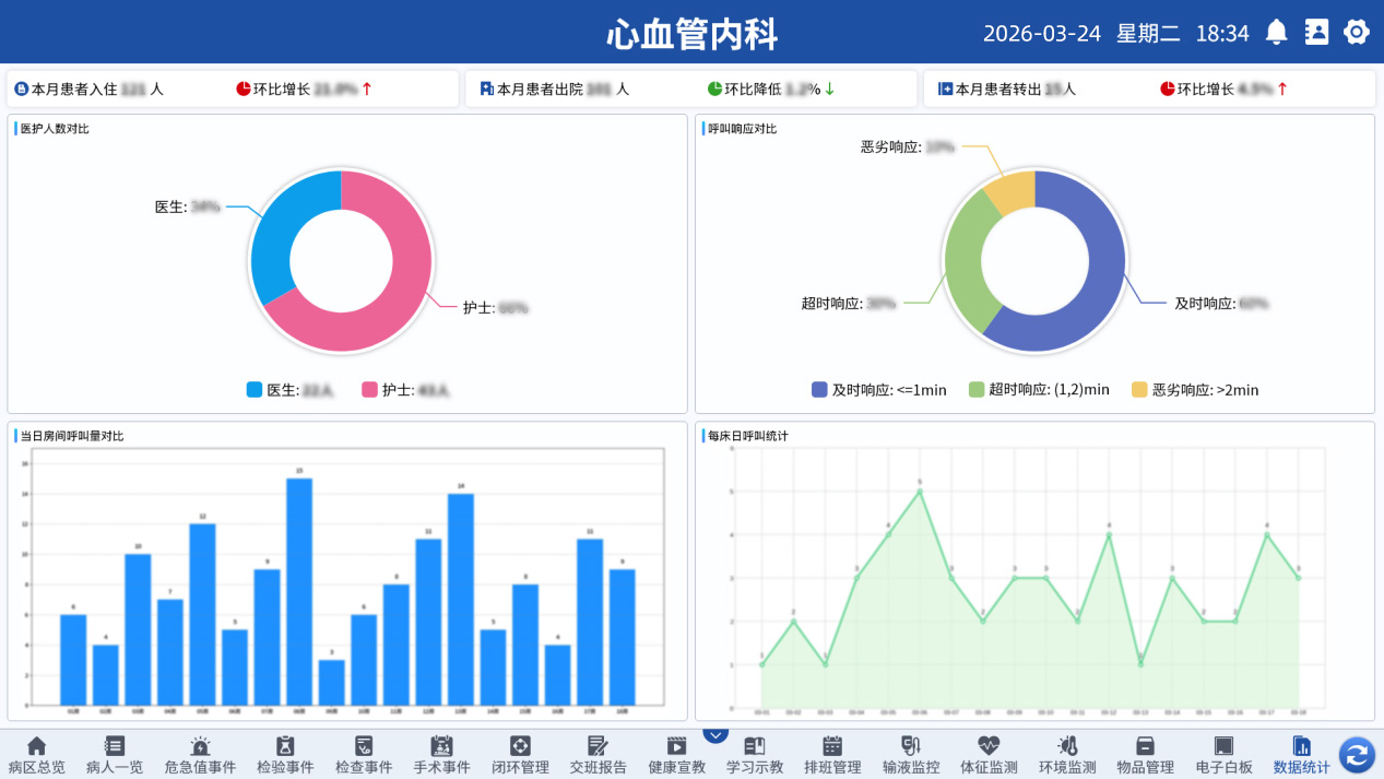 系统可扩展接入输液监控、体征监测、环境监测、人员定位、跌倒监测、手术排程、手术进程等系统,可显示输液患者床号,输液状态、滴速,剩余时间,以及计时报警;显示病区内的所有房间的环境信息,温度、湿度,并可以远程调节病房内的智能家居设备;显示体温、血压、呼吸、脉搏、心率、体温单等数据,方便医护人员在护士站查看实时监测数据以及智能警报。